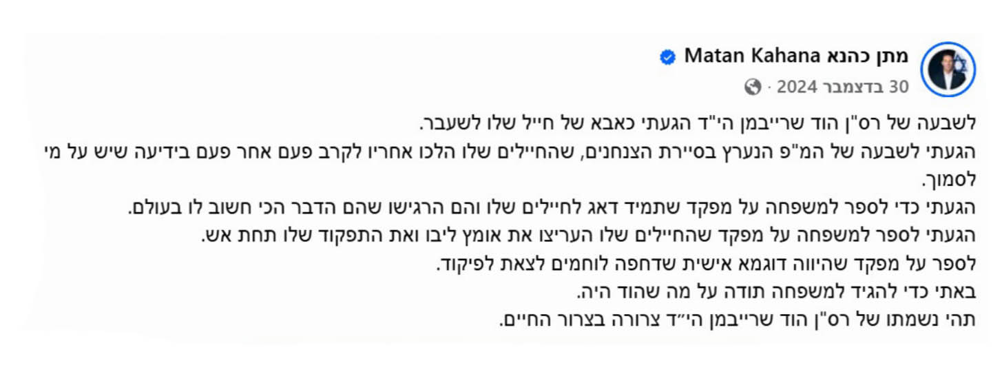 עוד רבים הסיפורים והזכרונות מאדם כל כך משמעותי, הוא לעד יהיה אור בלתי נפרד מהמשך הדרך הן כמפקד והן כאדם המבקש לחיות חיים של שליחות למען עמו. ושרק נהיה ראויים מספיק להמשיך את דרכו ולהנציח את ערכיו שהשאיר לנו, בצורה הטובה ביותר
